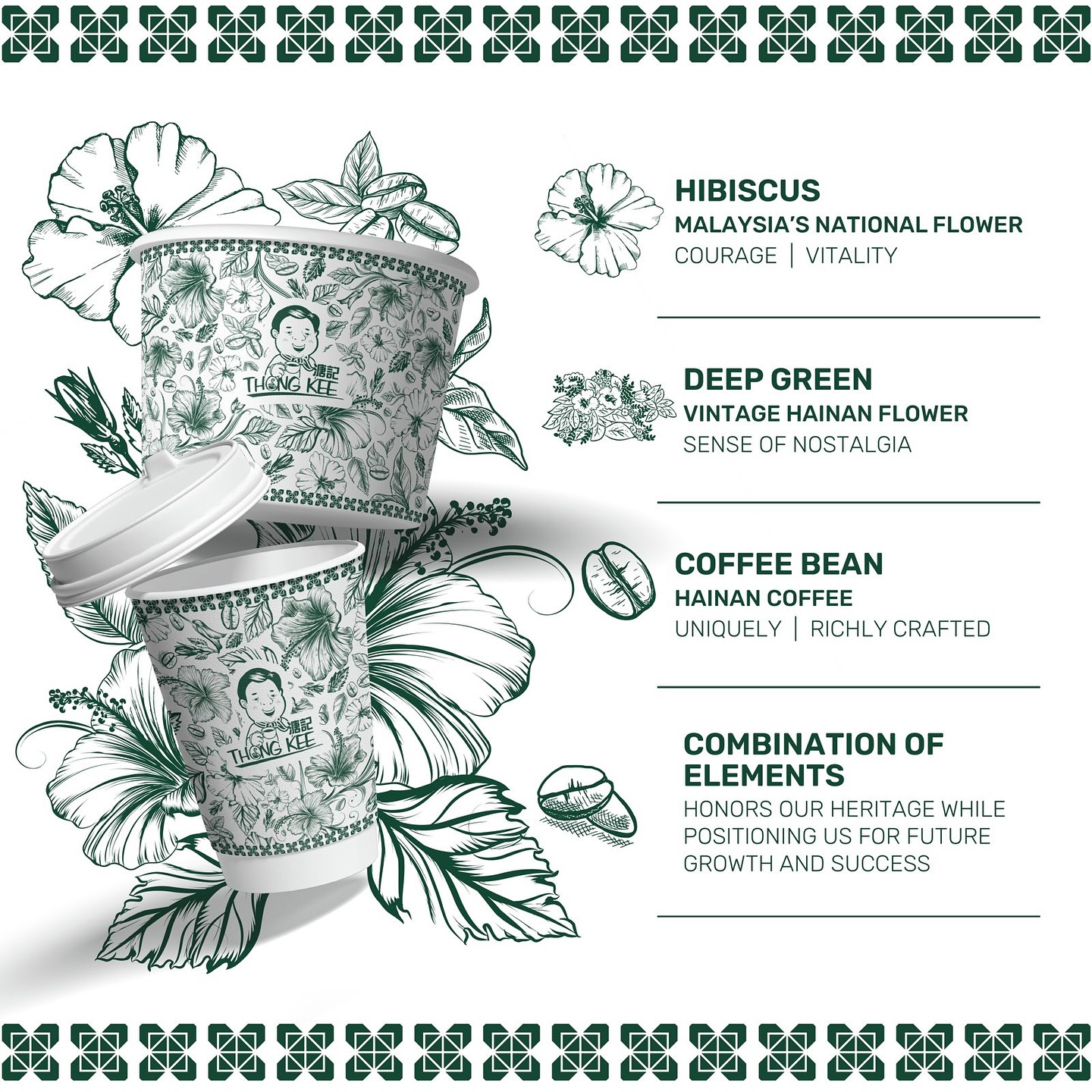 Element Selection: Featuring Malaysia’s national flower Hibiscus for courage, Hainan floral for nostalgia, and coffee beans for artisanal spirit.