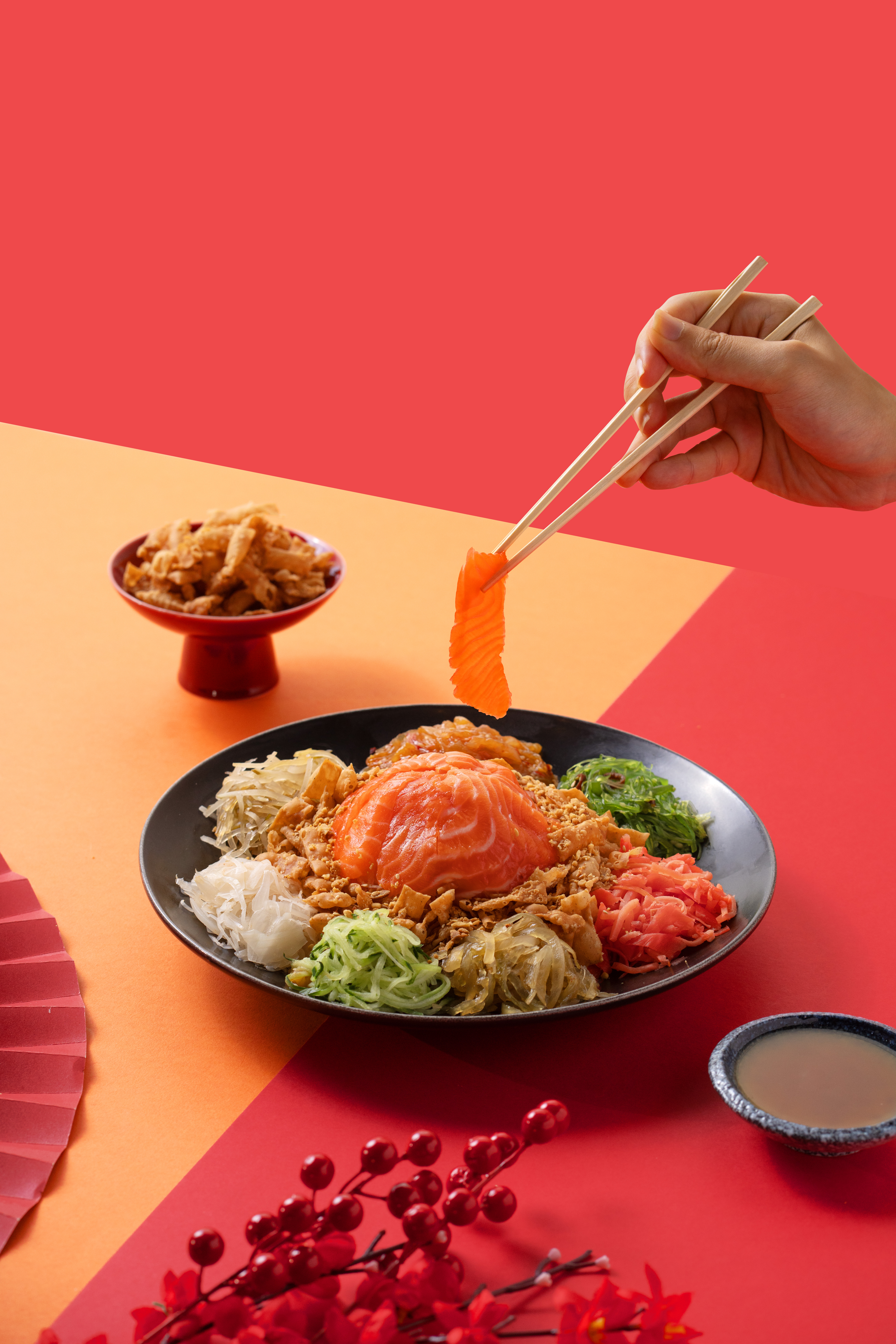 今年我们有幸为 Ume Tei 推出的新年产品——捞生进行了拍摄,我们大胆打破了传统的拍摄背景和风格,以全新的视觉呈现更加抢眼,也更符合当代年轻人的审美趣味。